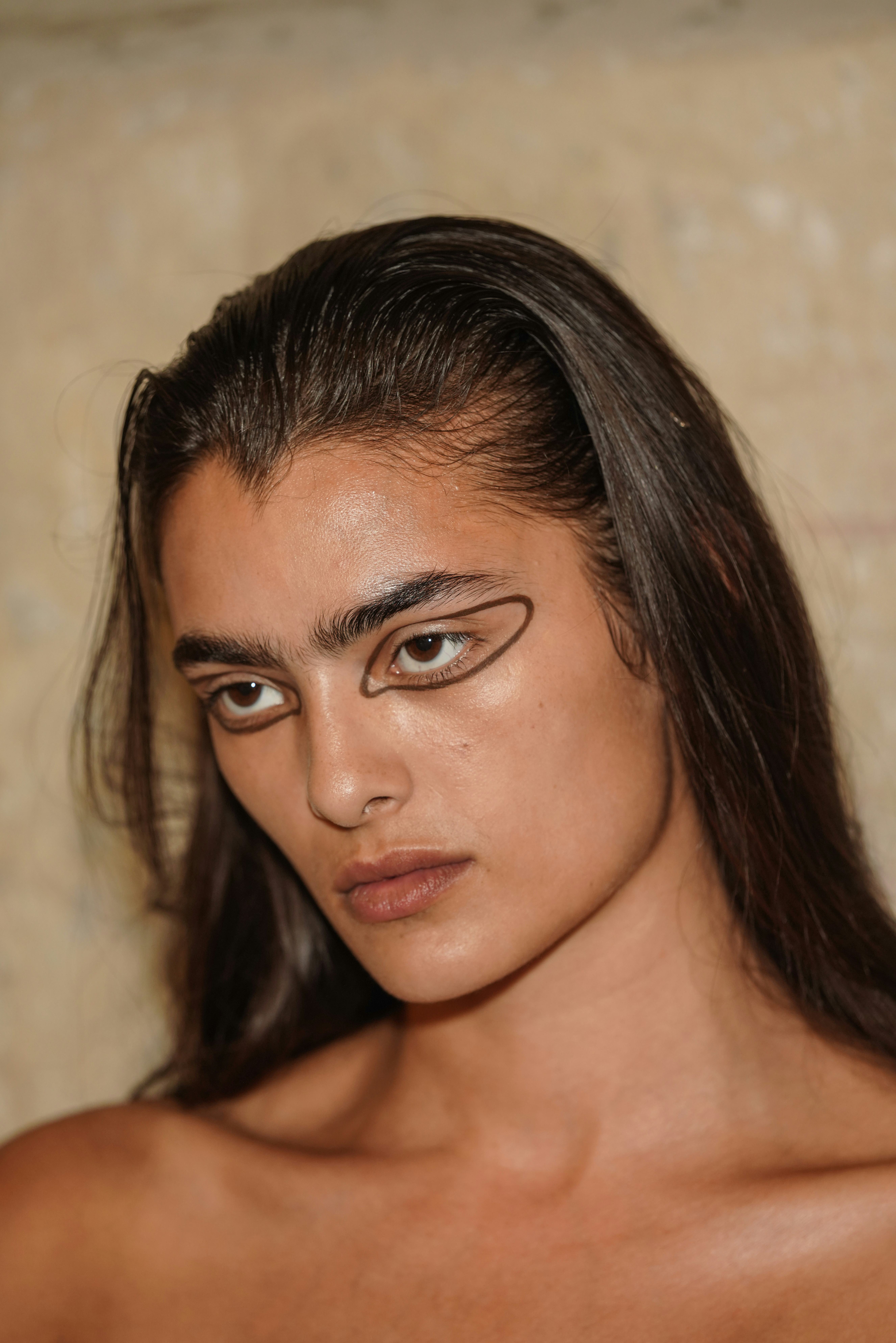 Abstract graphic eyeliner ဆိုတာက အခုချိန်မှာ ဆန်းတော့မဆန်းနေပါဘူး။ ဒါပေမဲ့ အခု NYFW24 မှာတွေ့လိုက်ရတဲ့ Eye makeup တွေရဲ့ Eyeliner တွေက နည်းနည်းပိုထူးခြားနေတာကလည်း ငြင်းမရပါဘူး။ Eckhaus Latta မှာ မော်ဒယ်တွေရဲ့ မျက်လုံးကို မျက်မှန်ပုံစံအကွင်းလေးတွေဆွဲထားတာမျိုး၊ Khaite မှာ မျက်ခုံးအောက် မျက်ခွံအပေါ်နားလေးမှာ Line လေးတကြောင်းပဲ ဆွဲတာမျိုးတွေက ကြည့်ရတာ ထူးဆန်းနေပေမဲ့ အထာကျနေတာကတော့ အမှန်ပါပဲ။